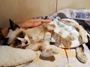 A este pequeñito lo trajeron a Salvatore a atenderse luego de sufrir un accidente. Tenía una fractura de pelvis, una fractura distal de fémur, ruptura de uretra y pesaba menos de 1 kg. Todo esto le impedía orinar, por lo tanto, la orina se escapaba llegando a filtrarse por debajo de la piel, la cual se le terminó cayendo debido al daño que le generaba la acumulación de orina.
